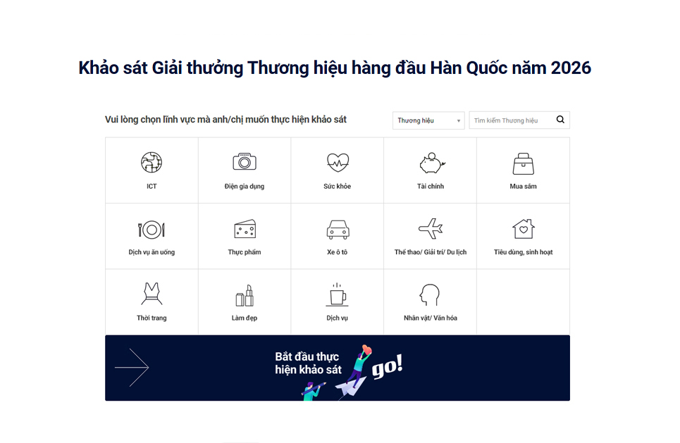 Chọn lĩnh vực anh/chị muốn khảo sát, sau đó vui lòng chọn mức độ kỳ vọng về lĩnh vực và mức độ hài lòng đối với thương hiệu mà anh/chị đã chọn.