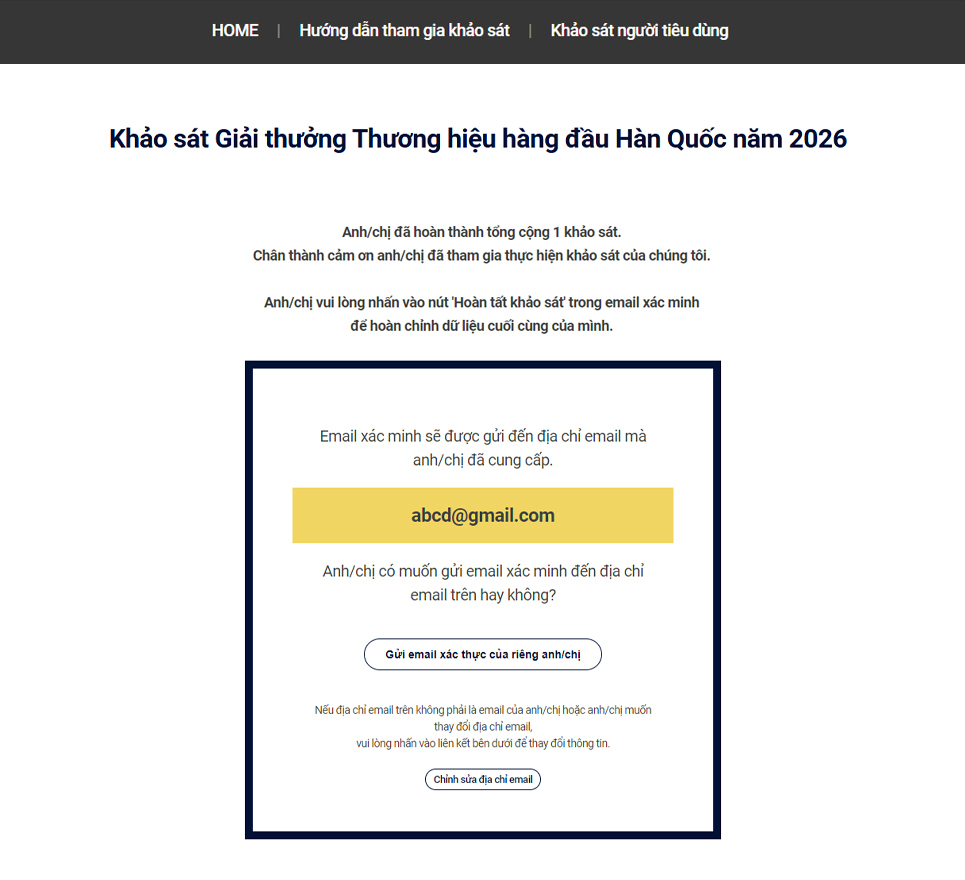 ② Trường hợp anh/chị không xác minh địa chỉ email của mình, địa chỉ email mà anh/chị đã cung cấp sẽ không được hiển thị trong kết quả khảo sát.