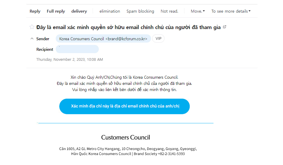 ① Vui lòng nhấn vào nút 'Xác minh đây là địa chỉ email chính chủ' trong email xác minh mà anh/chị nhận.